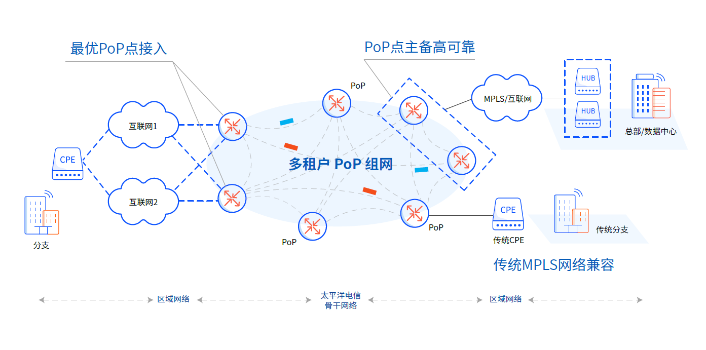 提供高可用、高稳定、高性能的SD-WAN解决方案,包括利用全球的 PoP 点资源实现就近接入,提供多 线负载共享、冗余边界部署及 “逃生通道” 设置,具备灵活带宽调配和智能纠错功能,以及提供一站式运维托管服务。