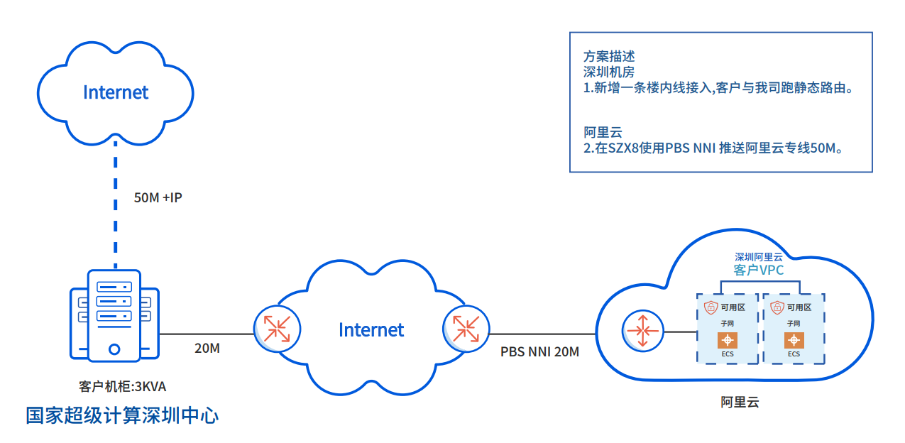 实现与公有云VPC对接,并在客户数据中心同步部署节点专用网络设备,数据中心楼内线帮助客户实现互联互通。